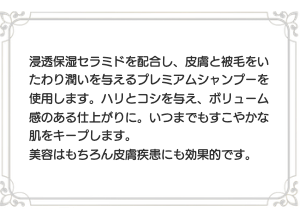 いつもご利用いただき、まことにありがとうございます。9月の人気オプションメニューは1位・超プレミアムシャンプー、2位・炭酸泉浴、3位・ましゅまろ泡パックでした。オプション併用時の仕上がりが好評です。皮膚・被毛の保護に大変効果が期待できます。そのため、アレルギー性皮膚炎に優れた効果を発揮します。ご予約の皆様、ご来店お待ちしております。